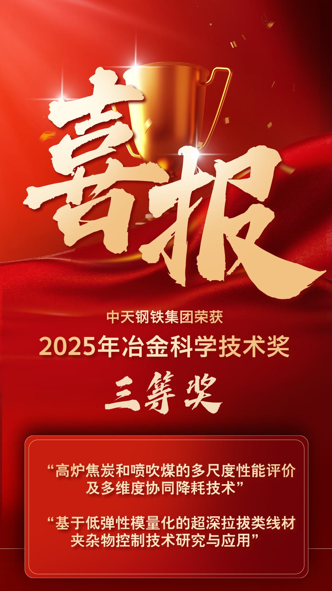 近日,中国钢铁工业协会与中国金属学会联合公布了2025年冶金科学技术奖评选结果,中天钢铁集团参与研发的“高炉焦炭和喷吹煤的多尺度性能评价及多维度协同降耗技术”和“基于低弹性模量化的超深拉拔类线材夹杂物控制技术研究与应用”两项成果双双荣获三等奖,彰显企业在钢铁冶金领域的创新实力。 作为中国冶金行业最高科学技术奖项,冶金科学技术奖旨在推动冶金工业科技进步和科技创新工作,激励利用科技力量促进冶金工业发展的行为,每年组织评审、奖励一次。 技创新再获佳绩 此次集团获奖的两项技术,分别针对钢铁生产中的燃料消耗优化与高端线材质量提升两大核心难题,实现了关键技术突破。 1、燃料消耗优化 在燃料优化领域,针对我国面临优质炼焦煤资源紧张、传统燃料评价体系不完善等问题,集团联合北京科技大学和武汉钢铁有限公司共同开展了“高炉焦炭和喷吹煤的多尺度性能评价及多维度协同降耗技术”项目研究,通过系统性地研究高炉炼铁过程中焦炭与喷吹煤的性能评价等关键问题,建立了焦炭高温反应行为的新型评价指标体系,开发了焦炭多元混配与分级装料技术,优化了喷吹煤分子结构建模与性能评价方法,并构建了高炉煤-焦协同降耗的动态调控系统。 目前,该技术已在中天钢铁、武汉钢铁等企业成功应用,取得了突出的经济效益和环保效益。 2、高端线材质量提升 针对超深拉拔类线材(如半导体晶圆切割钢丝、轮胎帘线钢等)因高熔点、高弹性模量夹杂物致断丝难题,集团联合北京科技大学发起“基于低弹性模量化的超深拉拔类线材夹杂物控制技术研究与应用”项目。 该项目创新提出夹杂物低弹性模量化控制理论,开发出低弹性模量夹杂物控制精炼渣和耐火材料,不仅大幅降低帘线钢冶炼电耗及耐材消耗,实现绿色化生产,还解决传统工艺夹杂物控制难题,打破国外长期垄断,取得显著经济效益和社会效益。 近年来,集团聚焦发展新质生产力,持续加大创新研发、智改数转等投入力度,不断提升企业“含金量”“含新量”。 截至目前,中天钢铁拥有“组合调控高均质化矩形坯连铸技术及产业化应用”“转炉能量高效利用与低排放技术集成与创新”等28项各级科学技术奖;17项科技成果达到国际水平,其中7项科技成果达到“国际领先水平”、10项科技成果达到“国际先进水平”、1项科技成果达到“国内领先水平”。